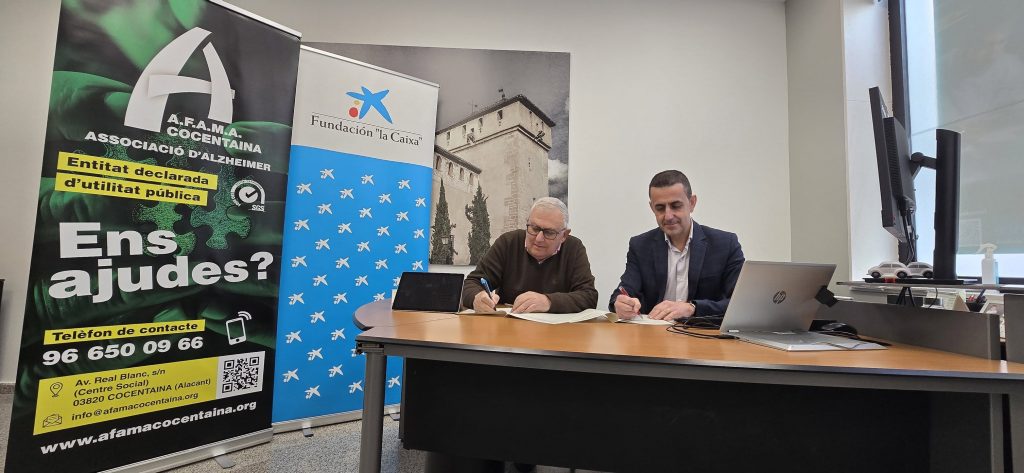 Ahir, el director de l’oficina de Cocentaina, Marcos Cascant Climent, va signar l’acta de lliurament de la donació de 2.411,05 € que l’Obra Social de l’entitat bancària CaixaBank ha concedit a AFAMA Cocentaina.